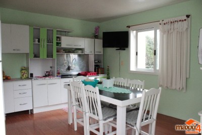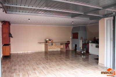 Descrição › Excelente casa com 200m², composta por cinco dormitórios, sala, cozinha, duas áreas de serviço e dois banheiros. Conta com duas garagens. Em ótima localização, possui quiosque nos fundo com churrasqueira, mais sobra de terreno entre a casa e o quiosque de aproximadamente 8m². Próximo a mercado, escola, creche ônibus.