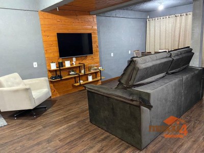 Descrição › Casa mobiliada de 02 pisos com 02 dormitórios com possibilidade 03 dormitório. Tendo no térreo, sala e cozinha. Na parte superior dormitórios, banheiro e sala de estar dupla onde se pode fazer um terceiro dormitório. Garagem para 03 carros com lavanderia, banheiro e churrasqueira. Pátio totalmente cercado. Financiável. Próximo de escola, creche, mercado, posto de saúde.